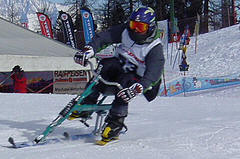 History ~~With the proliferation of ski areas in the 50's, 60's and 70's, the popularity of the sport continued to grow in Europe. Organized competition commenced during this time period with the first race being held in Obertauern, Austria in 1954. The Federation International de Skibob (FISB) was formed in 1961, resulting in the first World Championship contest in 1967. Continuing from this period until today, a series of FISB sanctioned international races have been held annually in Europe. The disciplines are analogous to alpine skiing: Slalom, Giant Slalom, Parallel Slalom, Super G and Downhill. ~~In America, skibiking enjoyed a period of relative popularity during the late 60's through the mid 70's. For further information see the USA-Retrospective page. Competition events were held throughout this period, culminating in an FISB sanctioned World Championship contest held at Mount Rose, Nevada in 1971. As a result of the late 90's skibiking renaissance, a competitive resurrection is occurring in the U.S. Beginning in 2003, contests have been staged annually. However, new Xtreme events have been added, unique to America. Freestyle and Snowcross matches now take place to compliment traditional European gate racing. As the progression continues each season, and new race venue's come on line, it would be reasonable to expect a variety of creative new formats, a 2.5 hour mogul Enduro was held in 2005. The fire has been re-ignited, momentum is building. How long until America can again be competitive internationally in traditional events? Will the U.S. lead the world in Xtreme contests? Will spaceship earth continue to fly? Questions, questions...